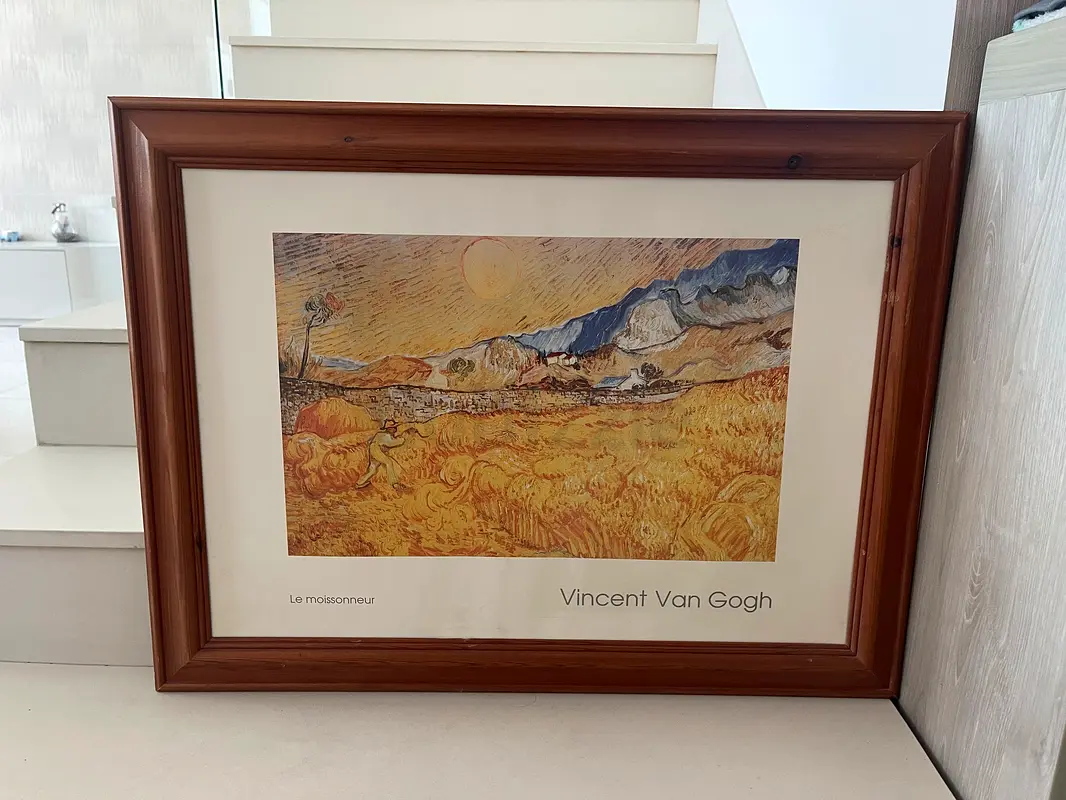 I'm selling a framed print of Vincent van Gogh's "Le moissonneuse" (The Reaper). In very good condition. The wooden frame has minor scuffs consistent with regular display; the print itself looks clear and unfaded It's ready to hang and would suit a living room, study, or gallery wall.