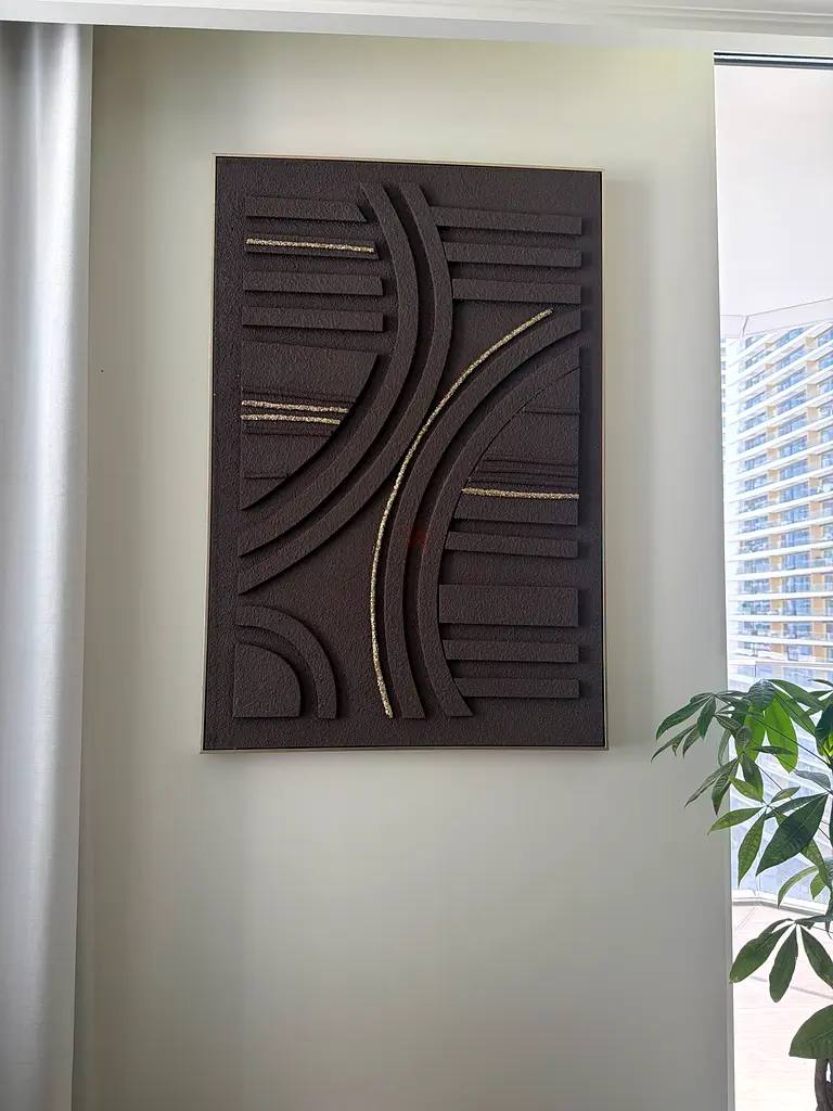 I’m selling a modern geometric wall art panel in brown with a textured foam or canvas finish. I bought it about a month ago and it’s in excellent condition with light, careful use. The piece features raised curved and linear patterns with subtle metallic accent lines that catch the light. It’s lightweight and ready to hang — comes with a framed backing and hanging hardware already attached. It’s ideal for a living room, office, or hallway and adds a contemporary, minimalist touch without being flashy.