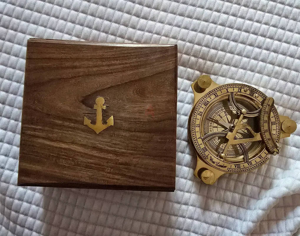 - Includes: Sundial compass and wooden box with anchor inlay