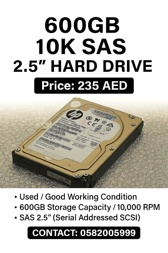 I’m selling an HP 600GB 2.5" 10K RPM SAS server hard drive. It’s about 2–5 years old and in good working condition — I’ve used it in a server RAID array with normal usage and it performs reliably. Drive interface is SAS (Serial Attached SCSI), 2.5" form factor, 10,000 RPM, 600GB capacity. Selling because I upgraded my storage. No warranty applies.