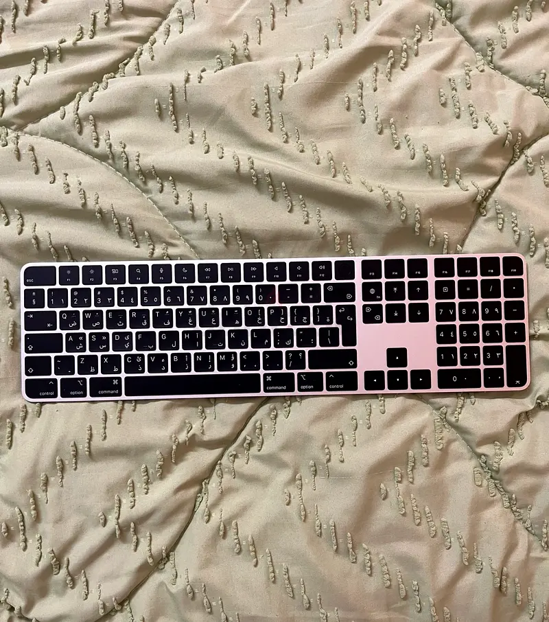 I'm selling my slim full-size Apple keyboard with Touch ID. It's brand new and has never been used, in flawless condition. The keyboard has a full-size layout with a numeric keypad and a visible Touch ID sensor on the top right. The body appears to be silver aluminum with black keys and is designed for Apple/Mac use.