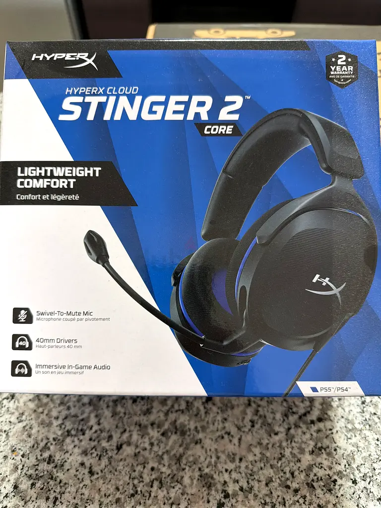 I'm selling a HyperX Stinger 2 Core gaming headset in its original box. It's brand new, never used and in flawless condition. The headset uses a wired connection and comes with the cable. There is no warranty.