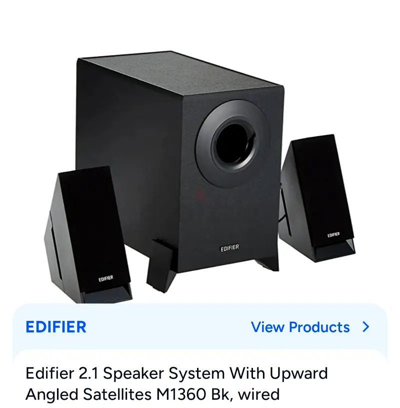 I’m selling my Edifier 2.1 wired speaker system (model M1360). I bought it about 1–6 months ago and used it only once, so it’s in flawless condition. It includes two angled satellite speakers and a powered subwoofer that delivers clear mids/highs and good bass for movies, music, and desktop use. Connectivity is via wired inputs; no warranty applies. I’m including the original cables and everything shown in the photos.