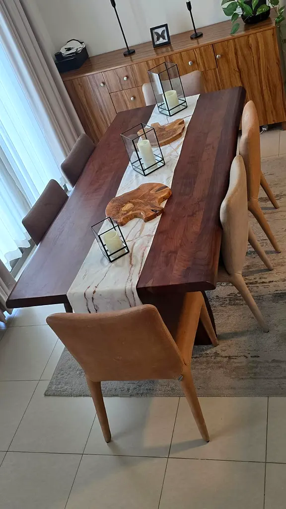 I’m selling my solid wood dining table with six upholstered chairs. I bought it about 2 years ago from Marina Homes and it’s been kept in excellent condition with light usage. The table is rectangular and finished in a warm brown tone; the chairs are beige/tan upholstered with wooden legs that match the table. The set is sturdy and practical for everyday family use and fits well in a modern dining room. There are no visible stains, tears, or structural issues.