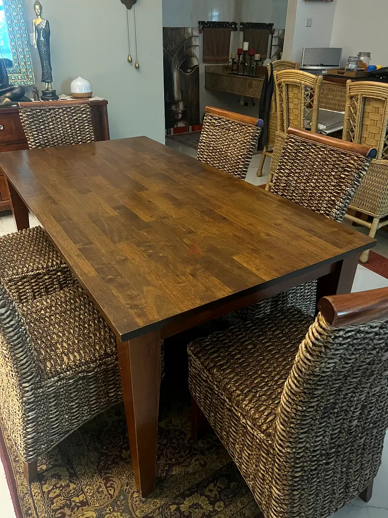 I’m selling a solid wood dining table with six woven rattan chairs. We’ve used this set for about 3 years and it’s in good condition with normal signs of use like minor surface marks on the table top and slight wear on the chair weave. The table is rectangular and seats six comfortably. The finish is a warm brown that matches the natural rattan tones of the chairs. It’s a sturdy everyday dining set suitable for family meals or casual entertaining. Pickup only.