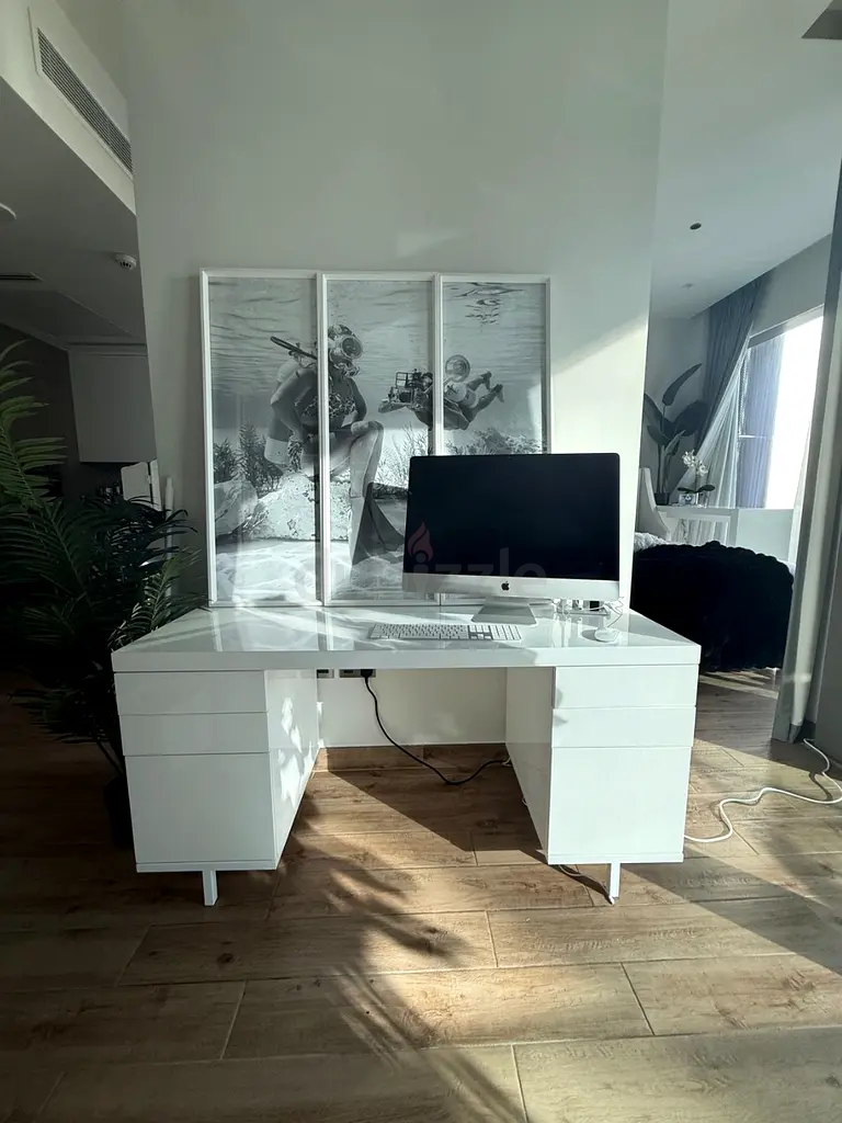 I’m selling my CB2 white modern desk with built-in drawers with hangling file capacity. I bought it about 1–2 years ago and it’s in excellent condition with normal home use. The desk is rectangular, seats one person comfortably, and has two sets of drawers on either side for storage. The white finish is clean and well maintained — no major scratches or stains visible. It currently fits a monitor and keyboard with room for paperwork or a laptop. Ideal for a home office or study corner. Paid 7,346 AED NEW and looking to sell it fast. I have a lot of other great stuff I need to get rid of so check out my listings to find other great deals on trendy high-end furniture.