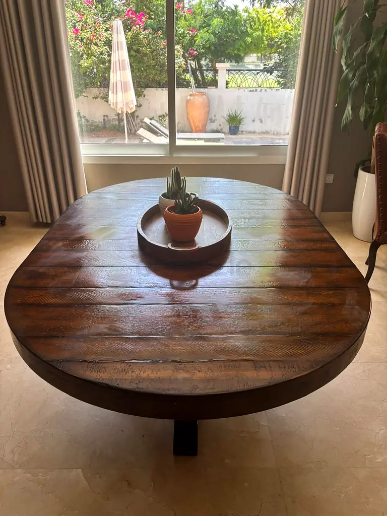I’m selling my Pottery Barn solid wood oval dining table in a rustic brown finish. I’ve had it for about 5 years and it’s in excellent condition with normal household use. The table comfortably seats up to 6 people and has a sturdy single-pedestal base. The top shows the natural wood grain and plank-style detailing that gives it a warm, rustic look — minor surface marks from regular use are visible but do not affect stability or function. It’s a heavy, well-made piece suitable for everyday dining or entertaining.