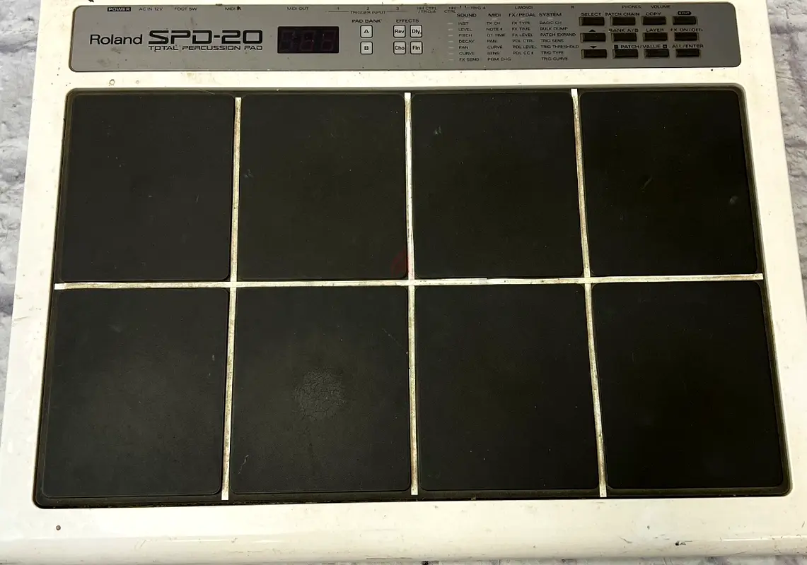 I'm selling my Roland SPD-20 sampling pad. It's been in my studio for over 10 years and is in good working condition — all nine pads and the front-panel controls respond normally. The unit shows cosmetic wear and surface marks from regular use but functions as expected. Selling the pad itself as shown in the photos.