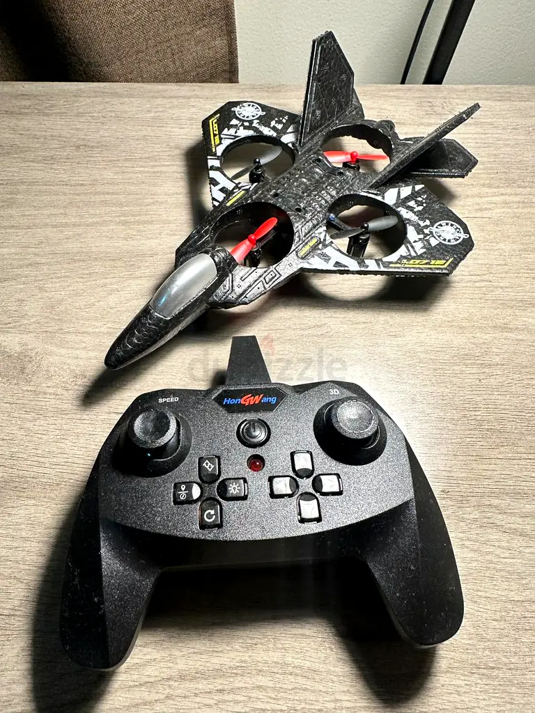 I'm selling my remote-control jet drone with its controller. It's in great condition with normal usage. The drone is working and responds to the controller, as expected.