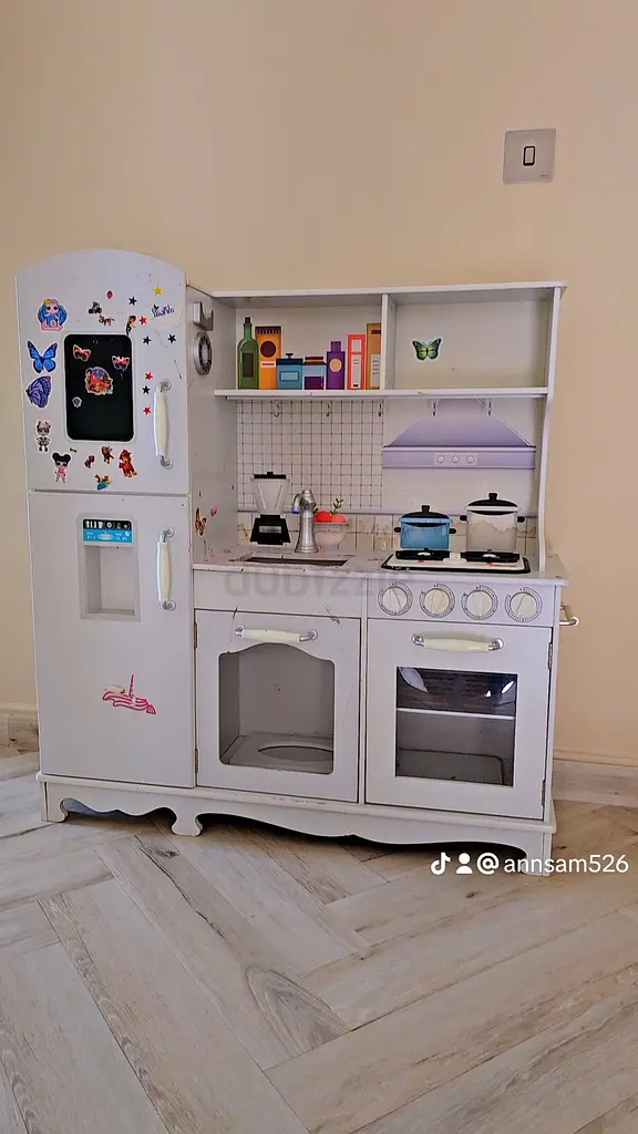 I’m selling a wooden play kitchen set that I bought about 1–2 years ago. It’s in excellent condition with light use — no damage, solid and clean. The set includes a fridge with a chalk/magnetic board area, a sink, stovetop with knobs, an oven with a clear window, shelving/storage above the counter, and a small built-in water dispenser feature. I’ve added a few stickers but these can be removed if you prefer a plain finish. Comes with some basic pretend accessories (pots, pan, kettle) as shown in the photos.