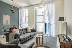 Our spaciously designed 1-bedroom apartment at Al Safa Complex ensures your comfort. Revel in the elegant furnishings, fully-equipped kitchen, and contemporary decor for a seamless and enjoyable living experience.