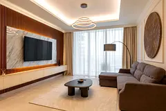 Nestled on the 5th floor, this apartment spans 119 m² /1283 sq ft., catering to solo adventurers, couples, families, and mixed groups alike. It accommodates up to 4 adults and a child. The apartment features two bedrooms with wardrobes, two washrooms, a living room, a designated dining area, a fully equipped kitchen, and a balcony with Sea & Dubai Eye views.