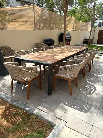 Outdoor teak dining table with 12 woven rope chairs