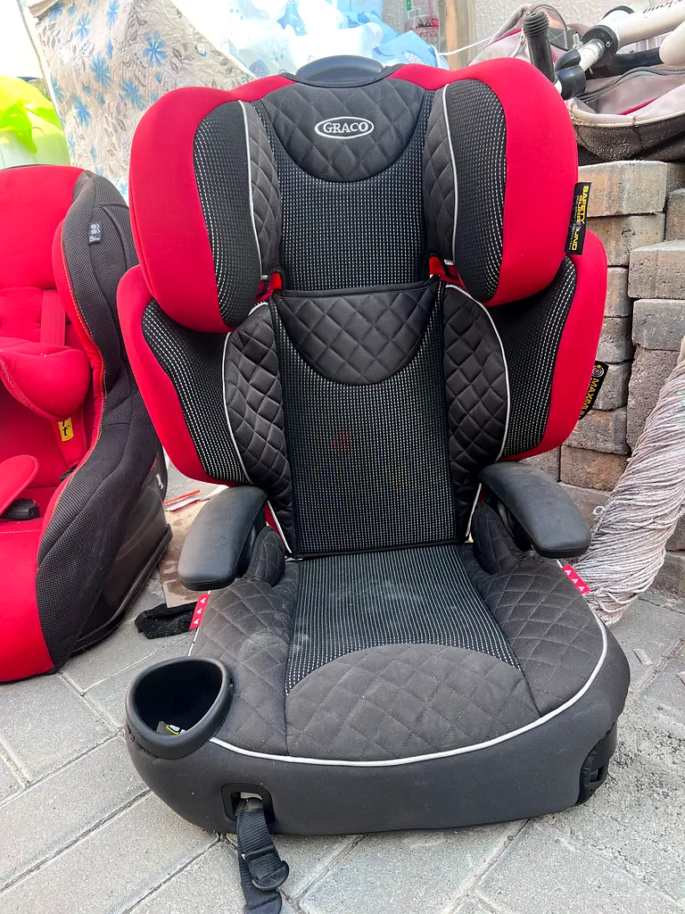 Selling a gently used Graco High-Back Booster Seat in a stylish red and black quilted design. This seat is perfect for transitioning children who have outgrown their toddler car seat but still need the safety and height of a booster.