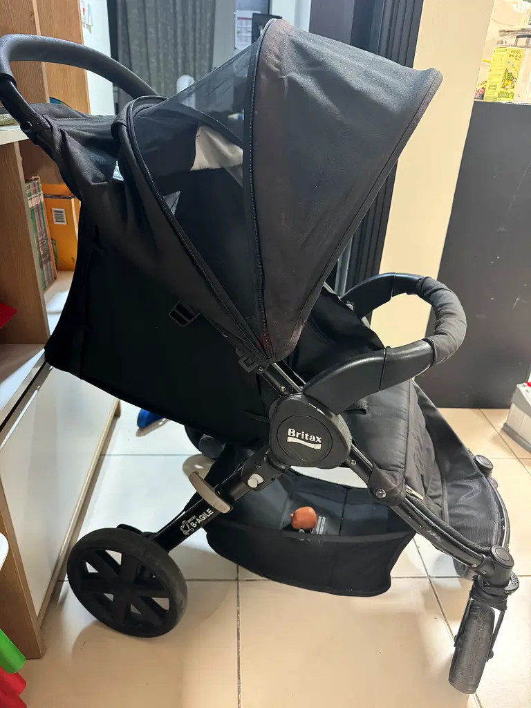 I'm selling my Britax black 3-wheel jogging stroller. It's about 2–5 years old and in good condition with normal use — no major damage, just some minor scuffs from regular use. The stroller has a large canopy with mesh ventilation, a padded seat with a five-point harness, adjustable handlebar, and a front swivel wheel that locks for jogging. It includes the all-terrain wheels which handle sand and uneven paths well. There's a storage basket underneath for essentials. Ideal for infants and kids across multiple age groups — from under 1 year (with proper infant insert or car seat adapter) up to about 8–10 years depending on weight. Selling because we no longer use it.