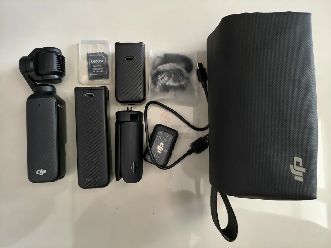 DJI Osmo Pocket 3 with accessories. Included are the Osmo Pocket 3 gimbal camera, two spare batteries, a small carry case/ pouch, a charging cable, a mini tripod/handle, a wind $%&! (deadcat), extra mounts/adapter pieces, and a memory card. Everything works well and has been kept carefully in the case.