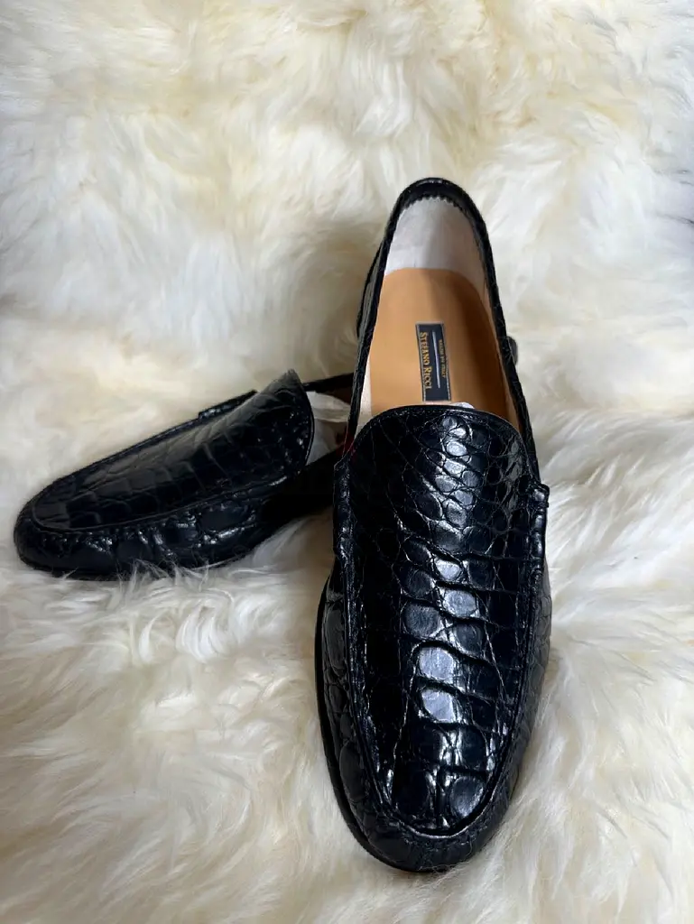 I'm parting with my brand new Stefano Ricci Black Crocodile Leather Loafers. These exquisite loafers are crafted from top-quality crocodile leather, giving them a luxurious touch and unique texture. They have never been worn and are in flawless condition, ready to elevate any smart-casual outfit or formal attire. With a comfortable fit in size US 10 (UK 9.5 / EU 44), they combine sophistication with ease.