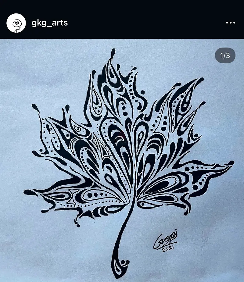 I'm selling an original ink-on-paper drawing I own — a stylized leaf rendered in black ink with flowing decorative patterns and fine dot work. The piece is signed and dated 2021. It has been lightly handled and remains in excellent condition, ready for framing or display as a collectible drawing.