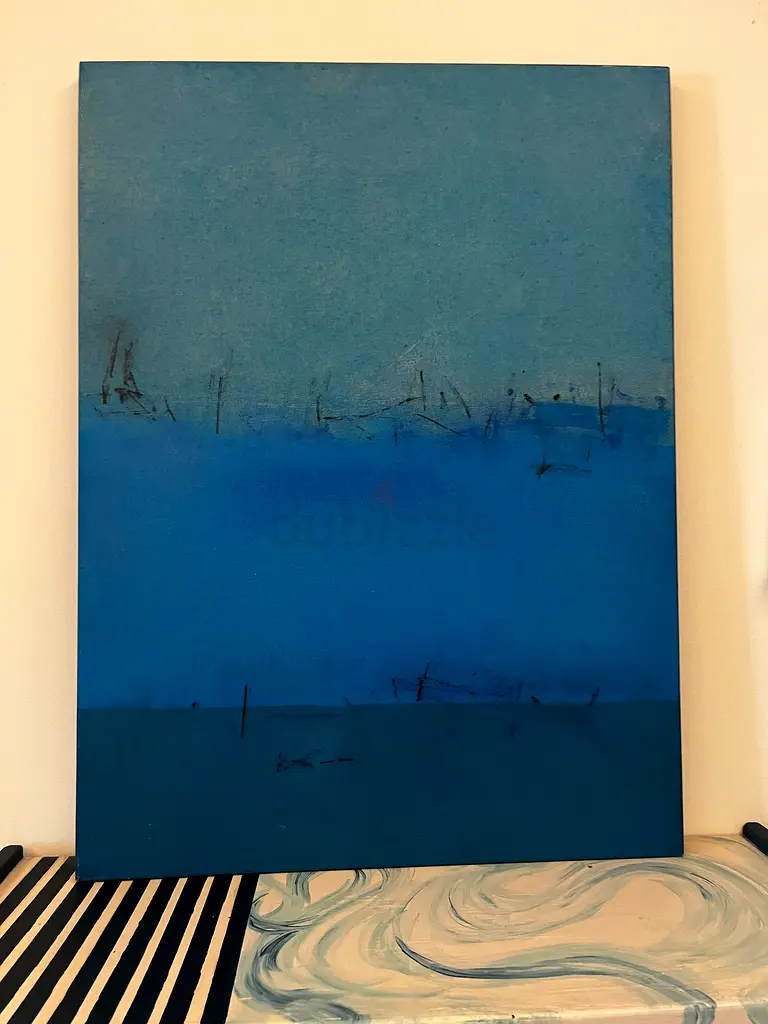 I’m selling an original Nitin Darawali abstract oil canvas painting featuring a blue gradient that suggests a minimal seascape. The piece is over 10 years old, in flawless condition. The composition blends lighter blue tones on the left into deeper blues toward the center and right, with subtle linear marks that resemble distant masts or horizon details. It’s a simple, calming artwork that would suit a living room or office with a modern or coastal aesthetic.