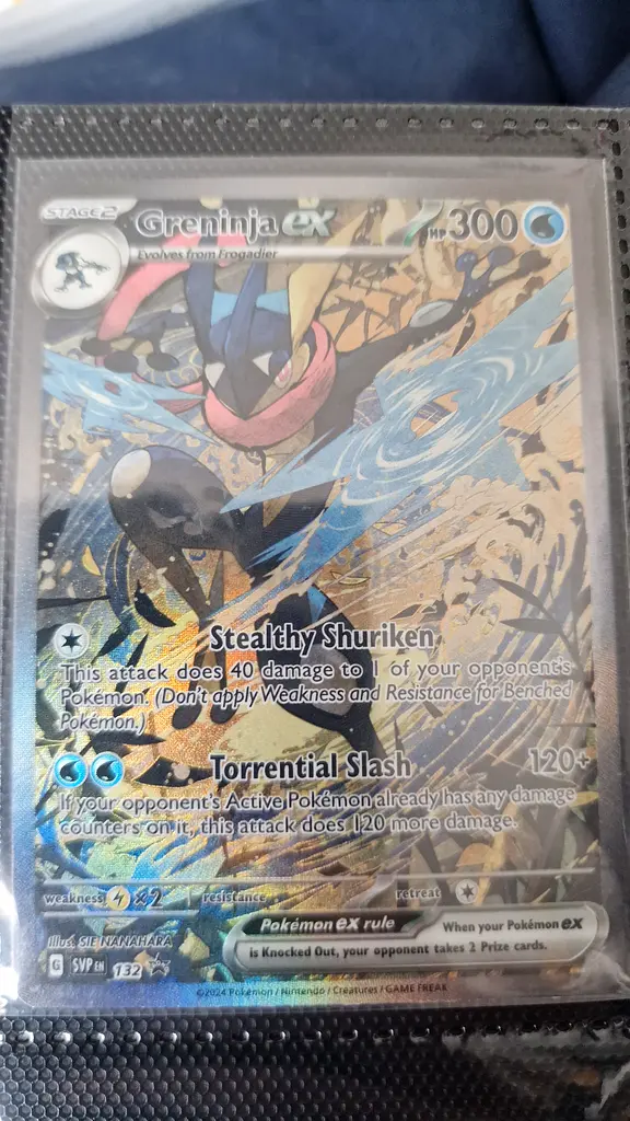 I'm selling a Greminja EX Trading Card in excellent condition. This card has been gently used and is perfect for any collector looking to add to their set. It features the unique abilities 'Stealthy Shuriken' and 'Torrential Slash,' making it a strong addition to any deck. The card has minimal wear and has been stored safely for the last couple of years.