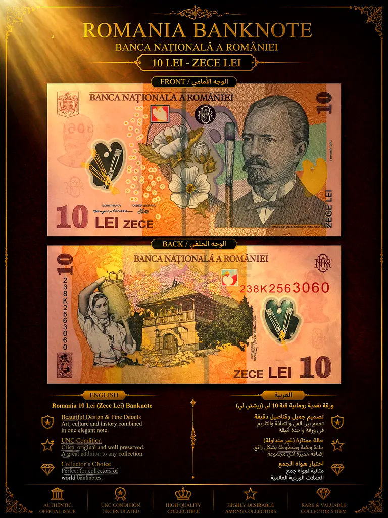 A stunning Romanian 10 Lei banknote featuring both front and back designs in a clean vertical display.