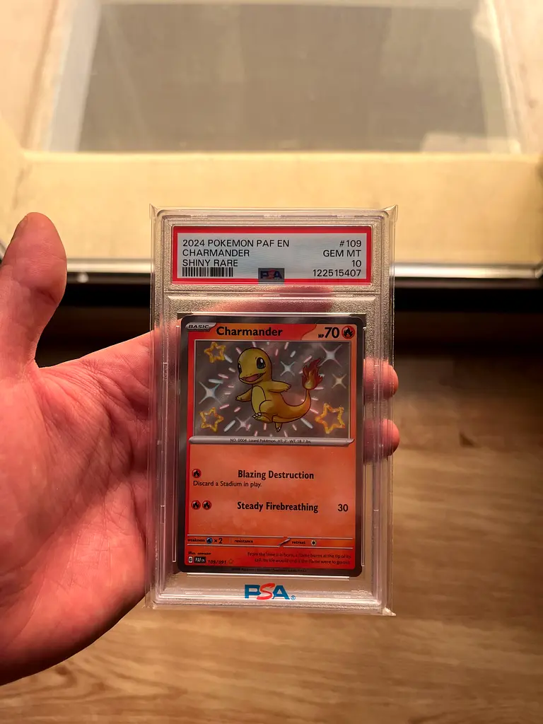 I am selling a 2024 Pokémon Charmander Shiny Rare Card in flawless condition. This card is brand new and has never been used. It features the beloved character Charmander with its iconic abilities, "Blazing Destruction" and "Steady Firebreath." This card is graded PSA 10, making it a perfect addition to any Pokémon collector's collection. Don't miss the chance to add this rare find to your set!