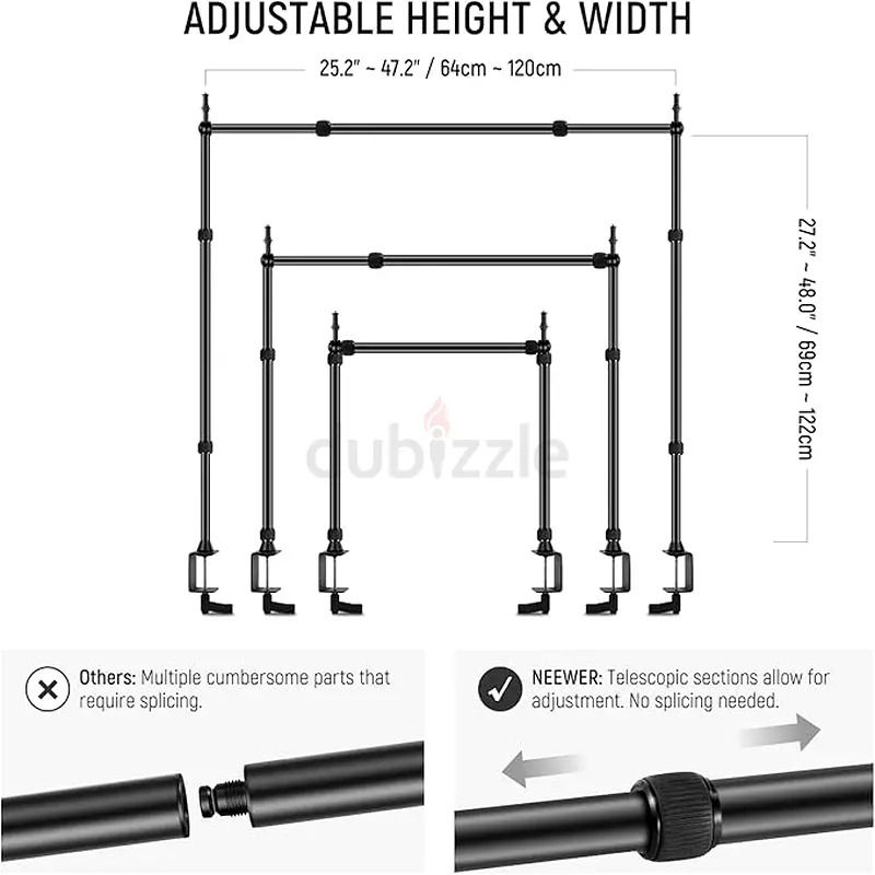 I’m selling an adjustable desktop support stand with clamp mounts that I’ve used lightly for about a year. It’s in excellent condition and works well for holding backdrops, lighting grids, or large design boards. The stand has telescopic sections so you can adjust both height and width without splicing; width adjusts from about 64cm to 120cm and height from about 69cm to 122cm. It clamps securely to tabletops with four sturdy clamp mounts and the finish shows minimal wear from light usage. There’s no warranty with this unit.
