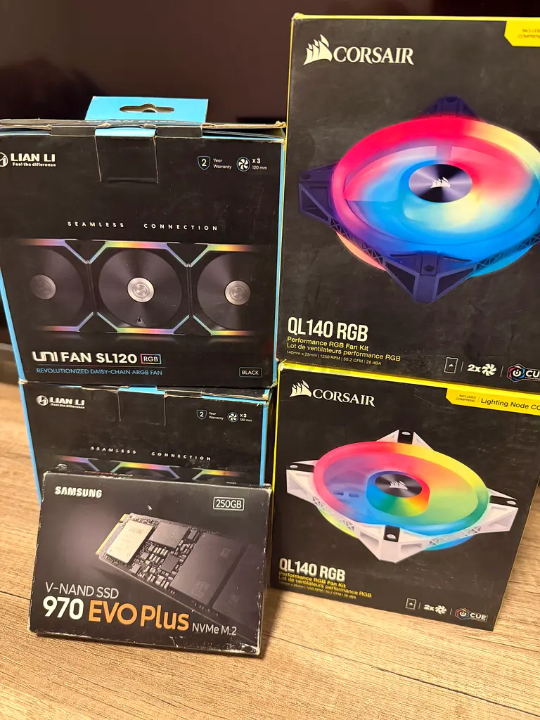 - Components: Corsair QL140 RGB (x2), Lian Li Uni Fan SL120 (3-pack), Samsung 970 EVO Plus NVMe M.2 SSD