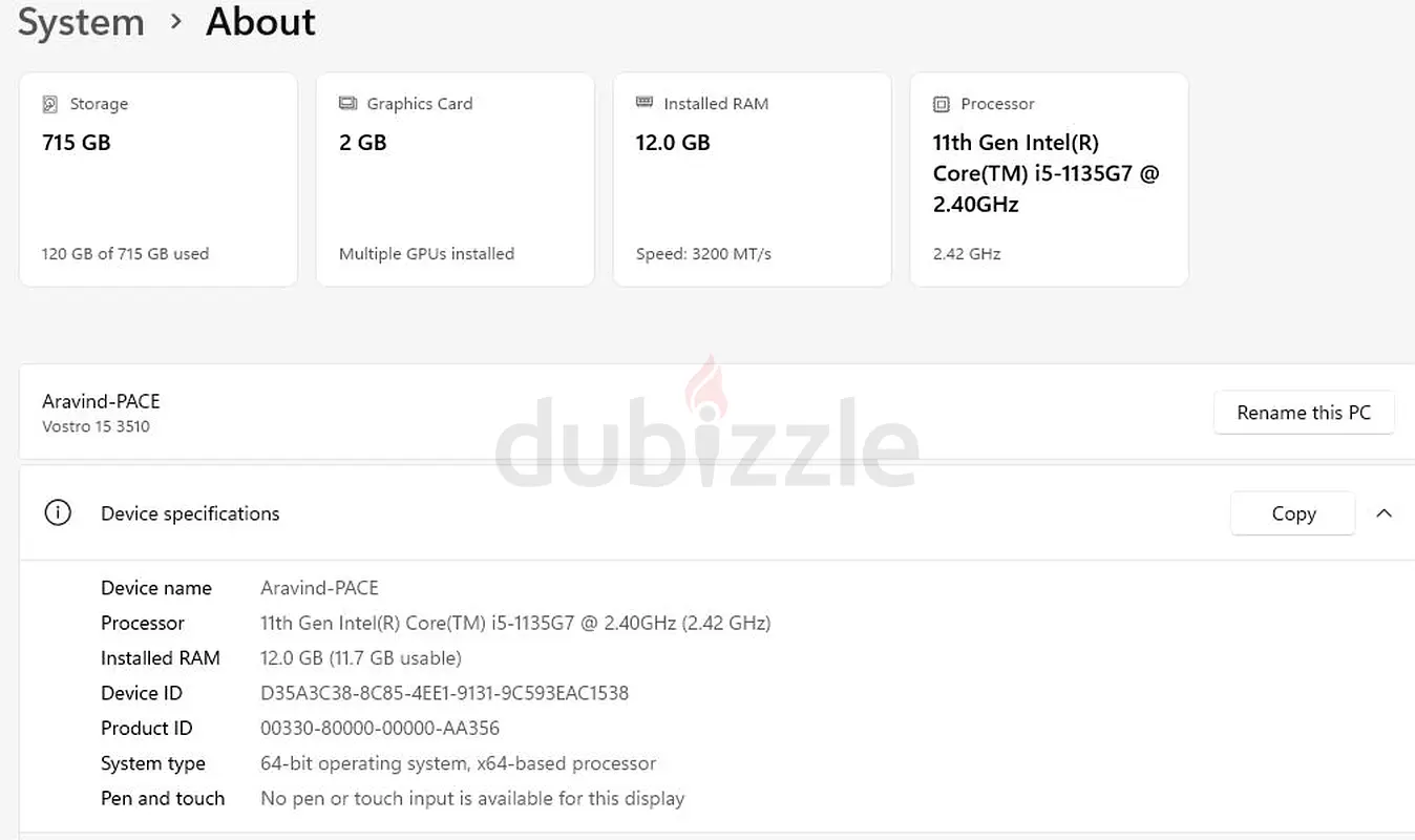 I am selling my Dell laptop that is powered by an 11th Gen Intel i5 processor and comes with 2GB of dedicated graphics. It's in excellent condition, having been used normally over the last couple of years. The laptop features a Full HD display with a resolution of 1280 x 720 pixels, which makes it great for casual use like browsing, streaming, and light gaming. Storage-wise, it has a 715 GB hard drive, providing ample space for all your files and applications. There is no warranty left on it, but it has been well taken care of.