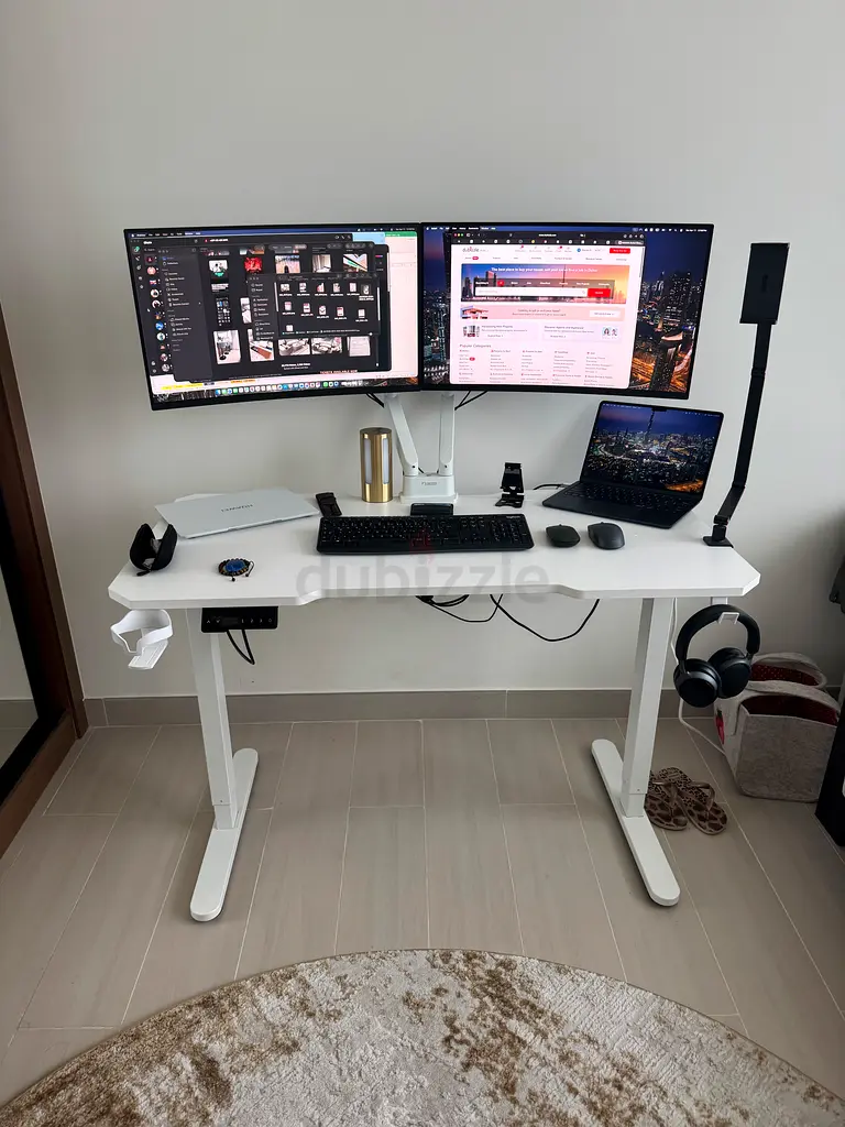 I'm selling a white adjustable standing desk that features dual LG monitors. This desk is in flawless condition and has only been used once. It's perfect for creating a comfortable workspace, whether sitting or standing. The design is sleek, and the functionality allows for easy adjustment to suit your preference. Included are the monitors mounted on the desk, the most itself + cable management tray making it a complete work setup ready to go.
