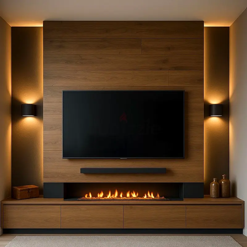 This modern entertainment system features a sleek design that seamlessly blends into your living space. It comes equipped with a wall mount for your TV, providing a streamlined look. The system includes a media console for organizing your devices and an elegant fireplace design that adds warmth and ambiance to the room. It's in excellent condition and has been used normally for the past 1-2 years. This system also comes with a warranty for peace of mind.