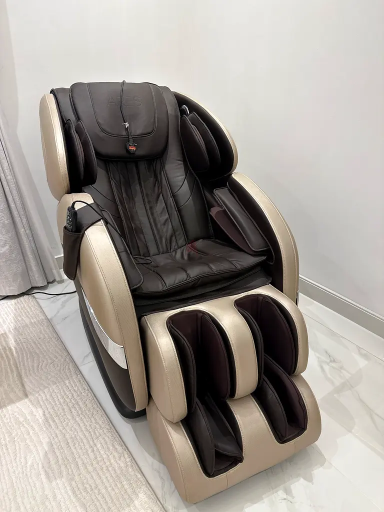 I'm selling my full-body electric massage chair in black and tan. It's about 1–2 years old and in excellent condition with light usage. The chair has multiple massage zones including neck, shoulders, back, arms, and legs/feet with dedicated calf and foot massagers. Controls are via a wired remote (shown) and the upholstery is intact with no tears or stains. It works perfectly and has all functions operating smoothly. Collection only; I can demonstrate it working when you view.