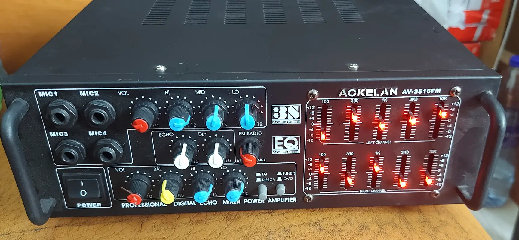 Designed for karaoke and audio amplification with balance and master volume controls.