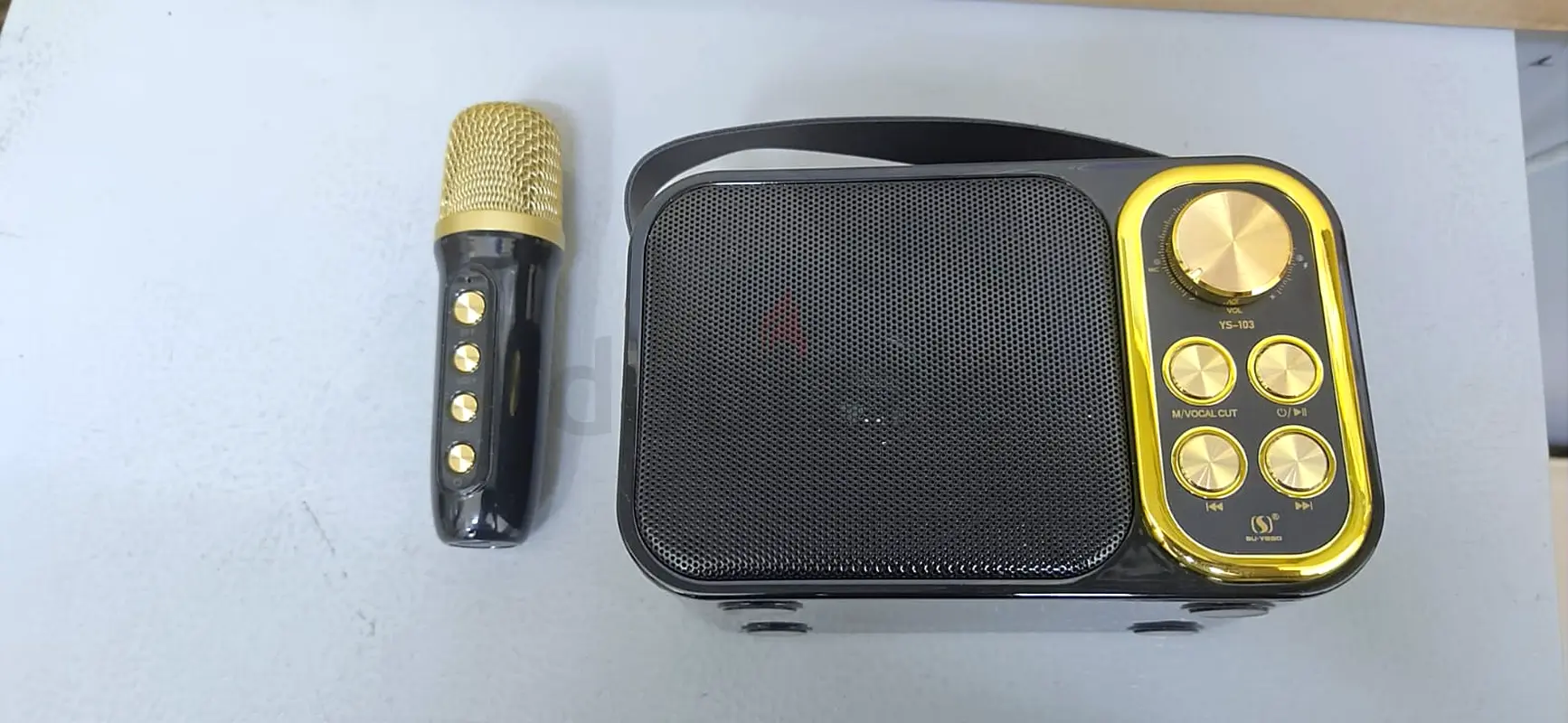 I'm selling a portable Bluetooth karaoke speaker I bought about a month ago. It's in good condition and lightly used. The speaker comes with the wireless handheld microphone shown and pairs via Bluetooth. The unit has a built-in control panel with a large volume knob and playback/echo buttons, and it is fully functional. No warranty applies.