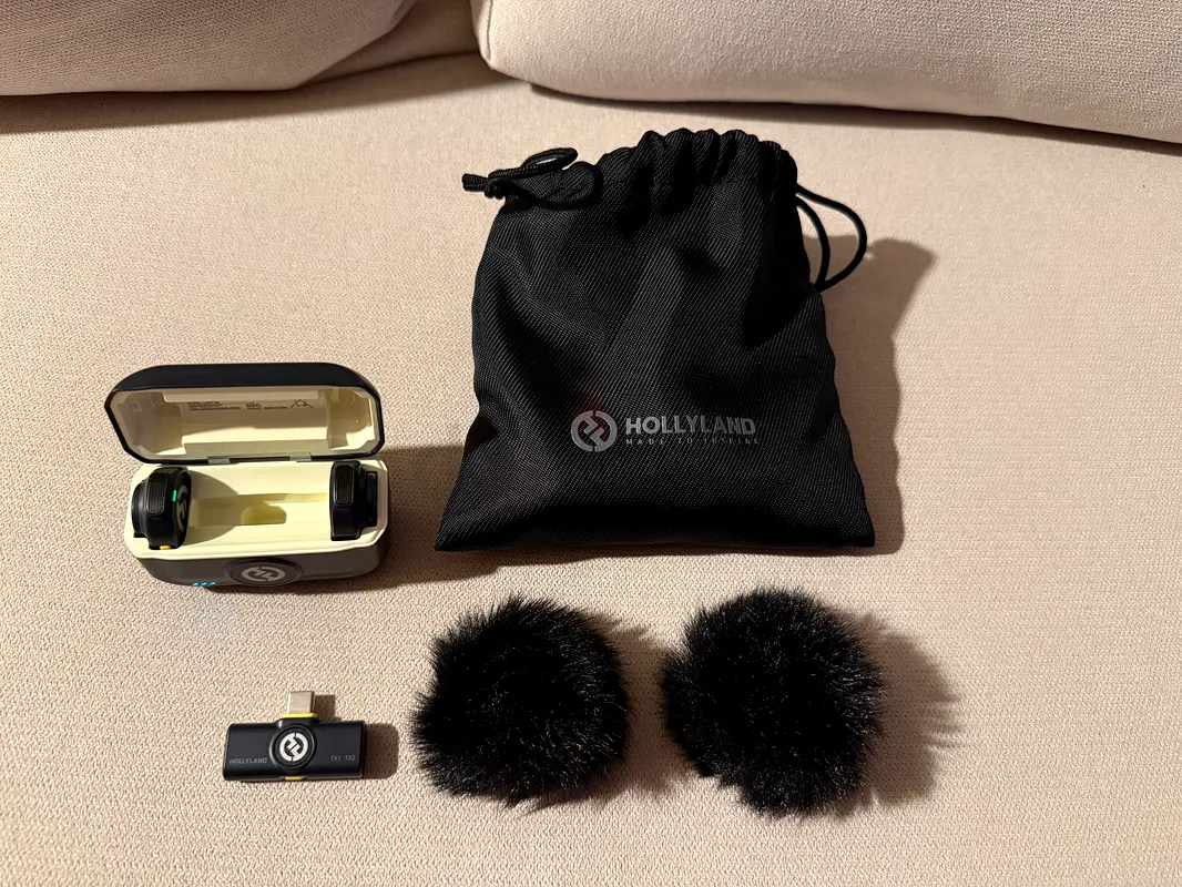 I'm selling my Hollyland Lark M2 USB-C wireless lavalier mic set. I bought it a few months ago and it's in flawless condition with only light use. The set includes the charging case with two transmitters, two furry windshields, the USB-C receiver, and the original drawstring pouch. No warranty is included. It works perfectly for interviews, vlogging, and on-the-go recording — battery holds well and audio is clear. Selling because I no longer need it.
