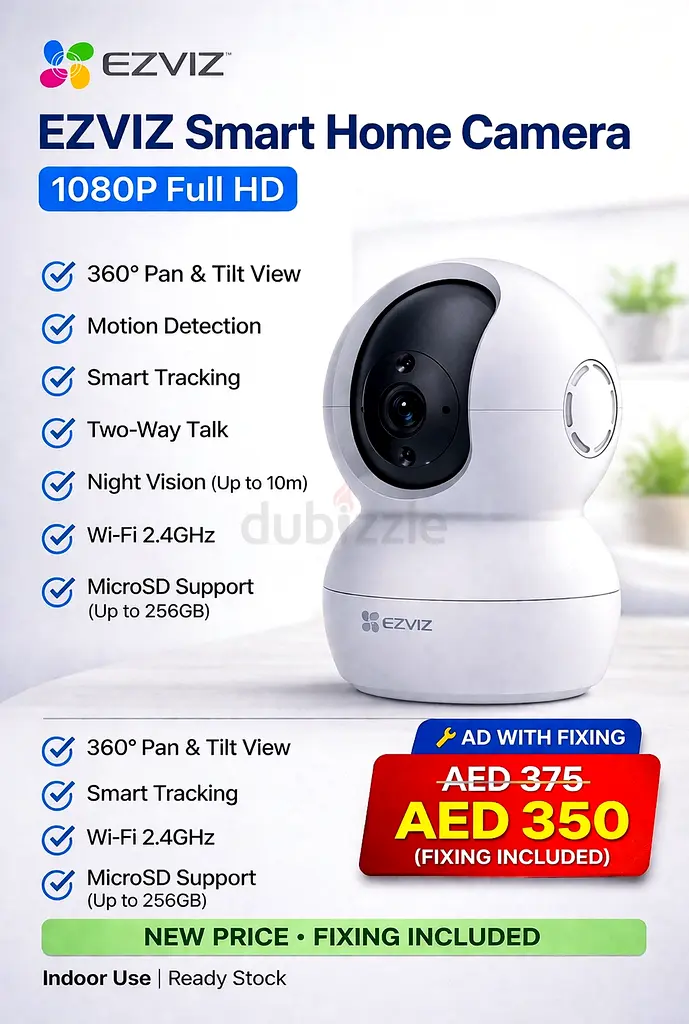 I’m selling a brand-new EZVIZ 1080P Smart Home Camera (pan & tilt). It has never been used, is in flawless condition, and still under warranty. This Wi‑Fi camera supports 360° pan and tilt for wide coverage, smart tracking and motion detection, two-way talk for remote communication, and night vision up to 10 meters. It works on 2.4GHz Wi‑Fi and supports local storage via microSD (up to ). I’m including the fixing/installation service as shown in the listing. Perfect for indoor use and ready to set up.