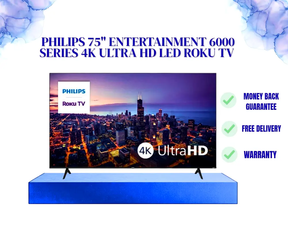 Philips 75 Inch 6000 Series 4K Ultra HD LED Roku Smart TV delivers stunning picture quality with vibrant colors and sharp details. It features built-in Roku for easy streaming of Netflix, YouTube, and more. With a large 75” screen, it offers an immersive home entertainment experience, perfect for movies, sports, and gaming