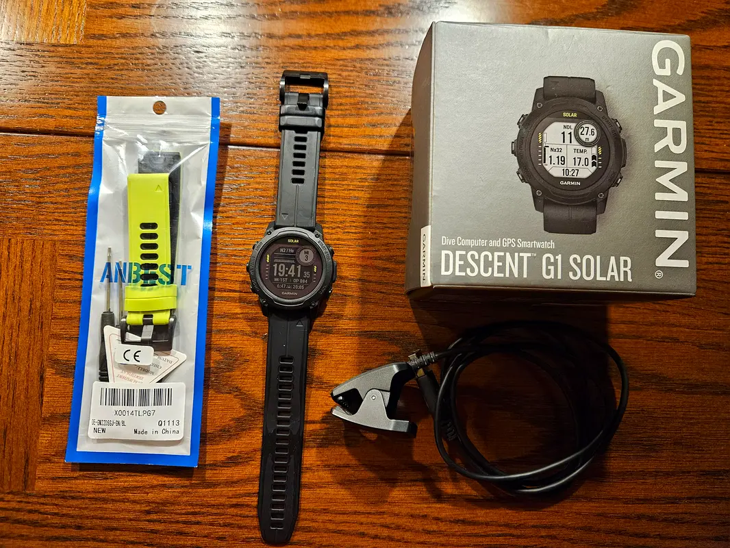 Selling my GARMIN Descent G1 Solar Dive Computer and Smartwatch. It comes with the original watch strap plus a brand new neon-green one. The glass is flawless, just the strap shows some wear and tear.