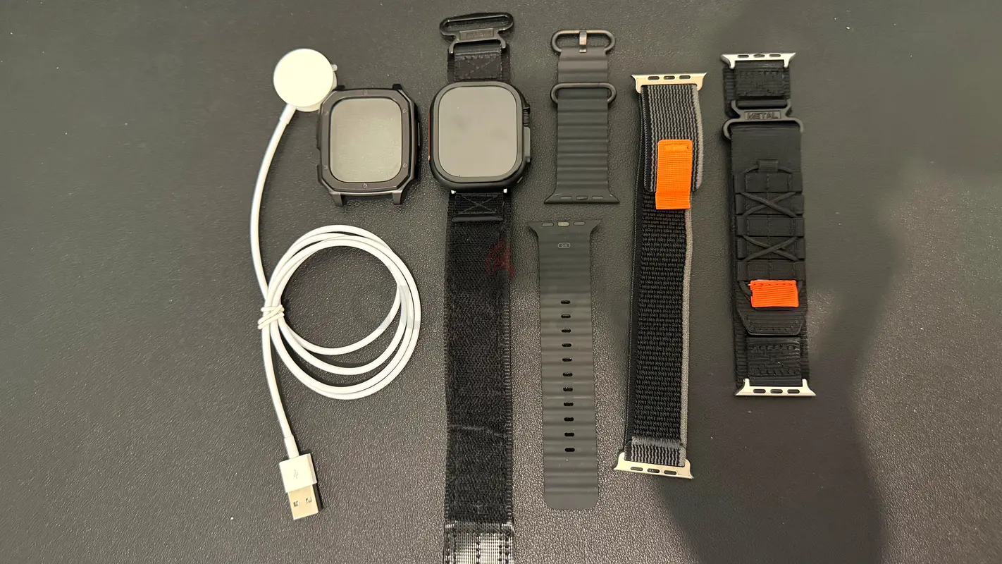 I'm selling a used bundle of Apple Watch straps and a genuine Apple magnetic USB charger. I've had these for about 1–2 years and they have seen light usage; overall they are in excellent condition. The bundle includes an Apple magnetic charger (USB-A cable), several interchangeable straps (silicone, woven nylon and a fabric/elastic strap with orange accents) and two protective watch case/adapters. Everything powers/connects as expected; there is no warranty. Please check compatibility with your Apple Watch size before buying.