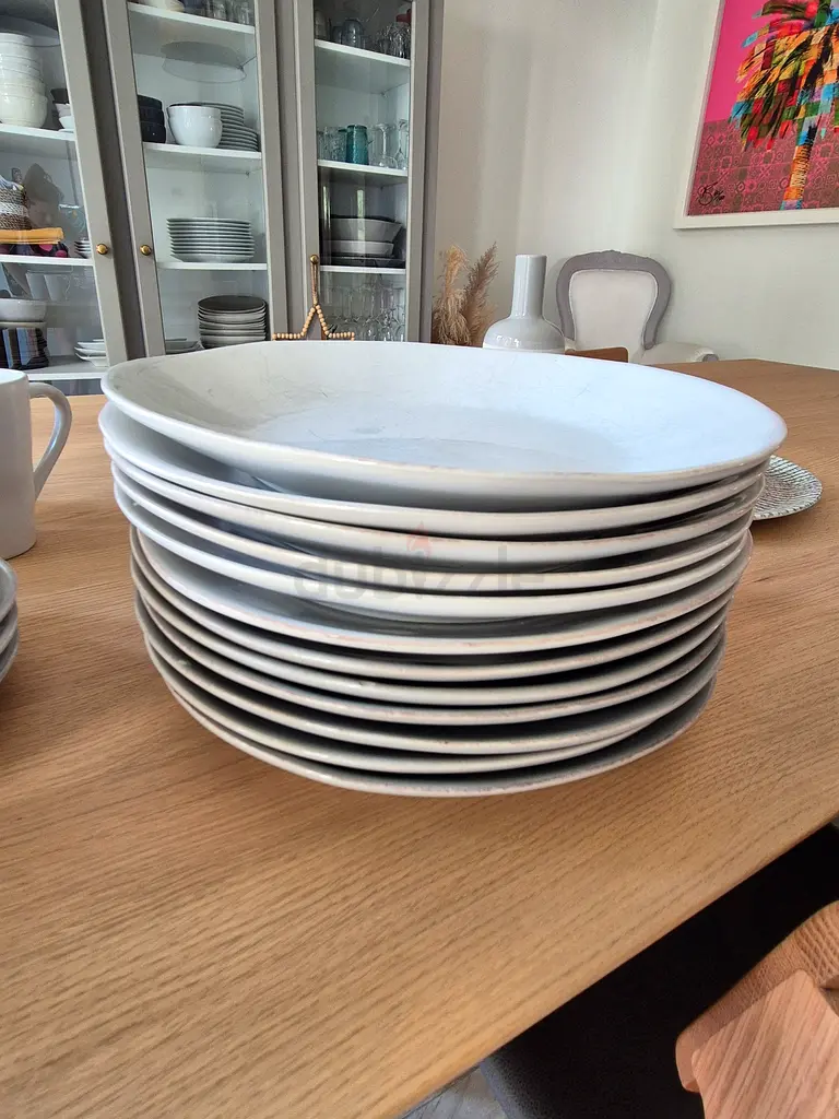 12 dinner plates from Crate & Barrel. 6 Grey and 6 off-white. + 11 dessert/salad plates. Same mix of color. + 3 coffee mugs. Some of the plates have small chips. Collection only, Arabian Ranches. First come first serve.