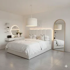 - Material: Upholstered fabric with padded headboard