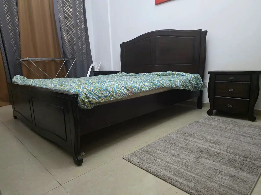 I’m selling my master bed with a matching nightstand and dressing mirror. The set is about 6–12 months old and in a very good condition with light usage — The frame is a very strong original solid dark brown wood with a curved headboard and matching footboard, sturdy slats (mattress is included), and decorative carved legs. The nightstand has two drawers with functioning handles and matches the finish of the bed. Ideal if you want a classic, solid wooden bedroom set in good shape.