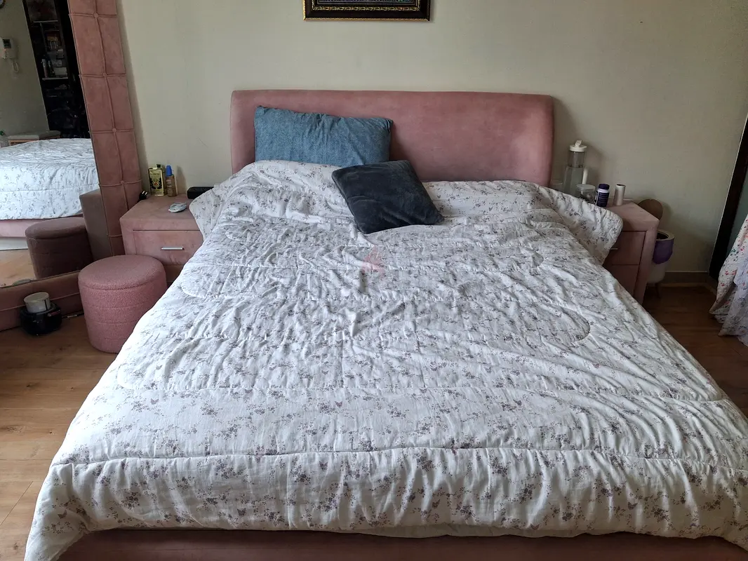 I'm selling my queen-sized upholstered bed in pink velvet from Homes R Us. I've had it for about 1–2 years and it's in good condition with normal everyday use. The set includes the padded headboard and two matching nightstands (as shown). The velvet upholstery is intact with minor signs of use; the frame is stable and comfortable for regular sleeping. Nightstands have some light surface marks but function normally. Mattress and linens shown are not included. Collection only; happy to answer questions or provide more photos.
