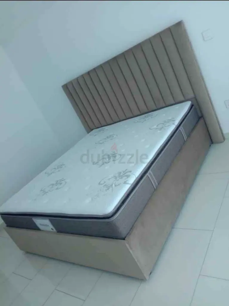 I'm selling a single upholstered bed frame with mattress in beige. It's an Amazon Basics set, brand new and never used, in flawless condition. The bed has a tall, vertically-channeled headboard and a supportive base with an included mattress that matches the frame. Perfect for a guest room or a small bedroom — neutral beige fits most decors. Available for pickup; mattress and frame are clean and unused.
