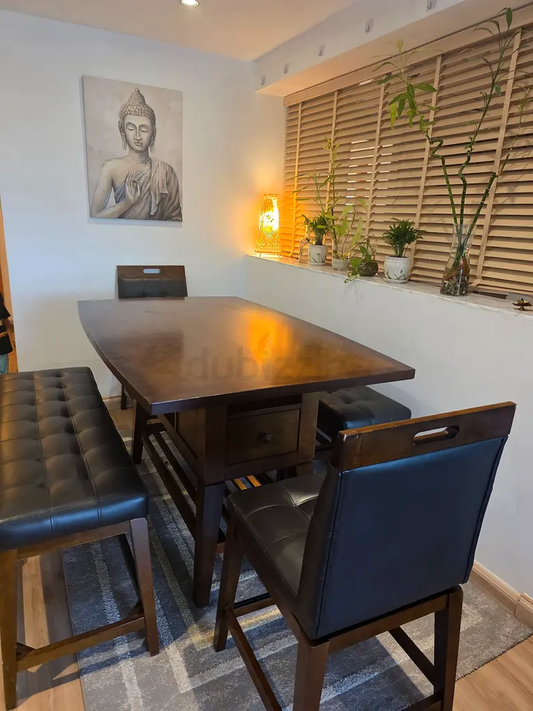 I’m selling my solid wood dining set from Home Center — rectangular table with a bench and two leather rotating chairs and 2 stools. I bought it about 2 years ago and it’s in excellent condition with only normal everyday use. The set comfortably seats six and the finish is a warm brown that matches the leather seats. Selling because we’ve rearranged our space and no longer need it.