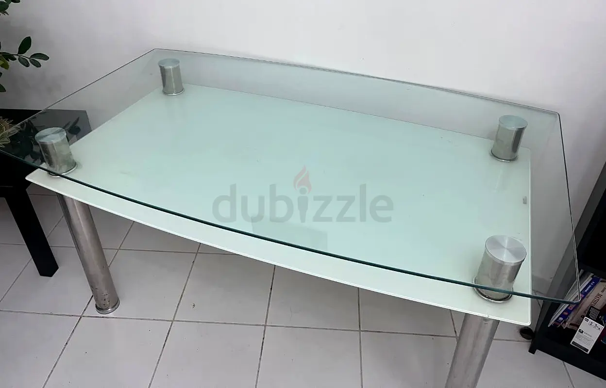 I'm selling my glass top dining table with six brown leather chairs. I bought it from Home Centre about 2–5 years ago and it's in excellent condition with normal home use. The set includes a rectangular tempered glass table with sturdy chrome legs and a matching center support, and six brown leather-upholstered chairs with chrome sled bases. The glass is clear with no chips or cracks and the chairs show minimal wear. It comfortably seats six and fits well in a modern dining area.