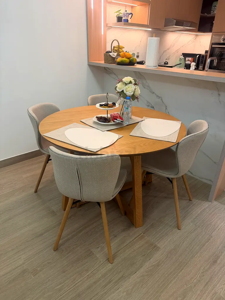 I’m selling a Sven 4-seater round dining table in light brown wood tone from Home Centre. I bought it a few months ago and it’s been used only once, so it’s in excellent condition with no scratches or marks. The table has a round top and a sturdy wooden base with a simple, modern design that fits well in small dining areas or kitchens. It seats four comfortably and is stable and well-built. Pickup in Al Furjan available or I can help arrange delivery for an extra fee.