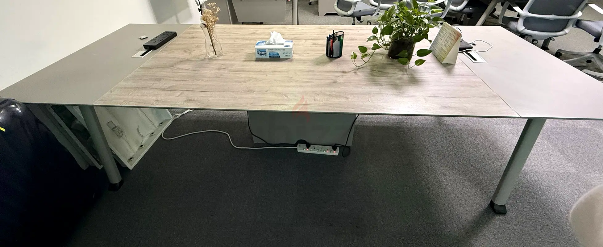 I'm selling my large shared office workstation desk that I've used for about 1–2 years. It's in excellent condition with normal office use and has space for three people to sit and work comfortably. The tabletop is brown wood-look with grey end panels and the frame has sturdy metal legs. There's an attached power strip and basic cable management under the desk, which kept cables tidy during use. The desk is rectangular and well suited for a collaborative office or a home workspace.