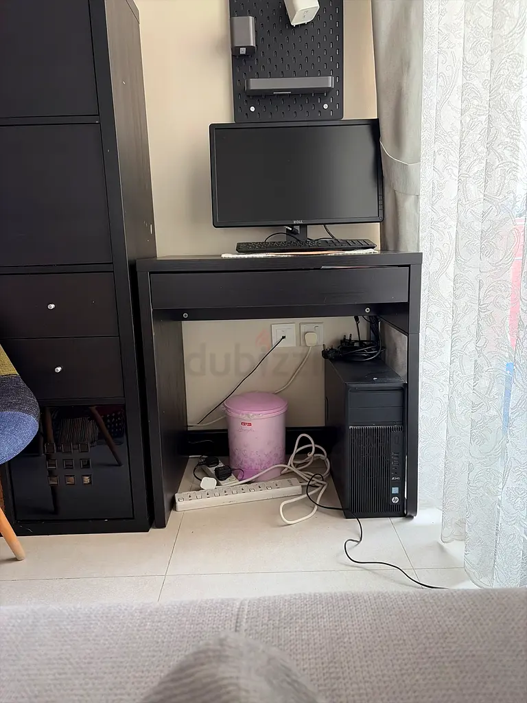 I'm selling my black computer desk with a built-in storage cabinet. I bought it about 1-2 years ago and it's in good condition with normal usage. It has a rectangular top for a single user, an open shelf suitable for a desktop CPU, and a cabinet with drawers for storage. Sturdy and practical for a home office or study.