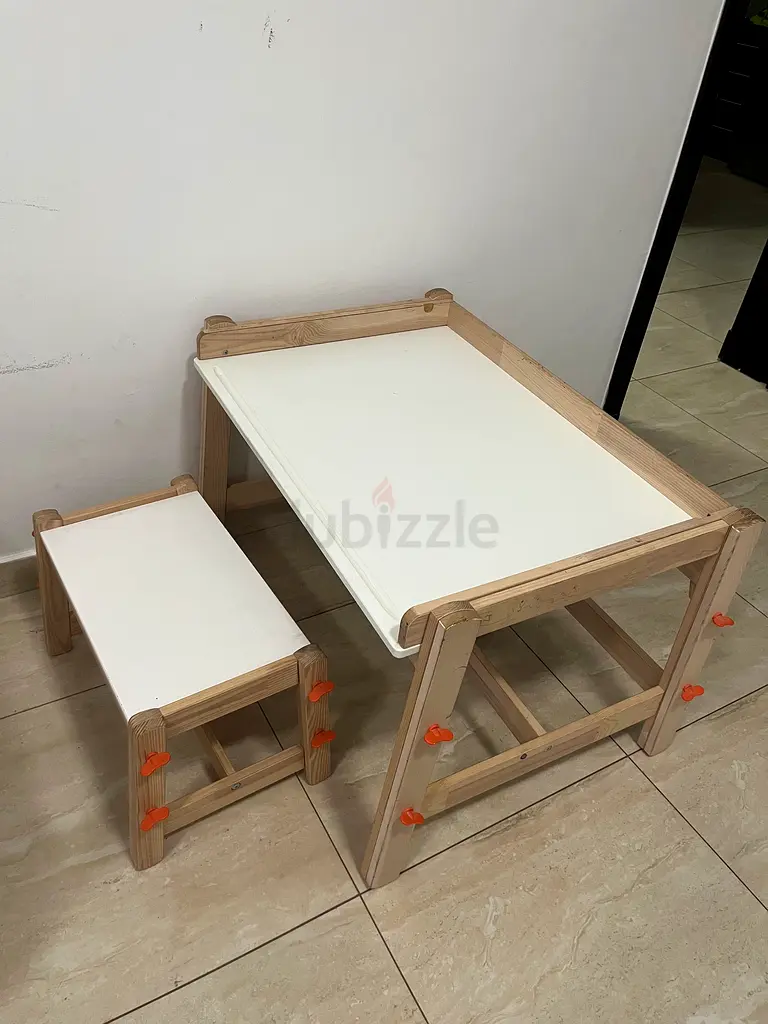 I'm selling a small Ikea kids table and stool set in light pine with white tops. I've used it gently for about 1–2 years; it's in good condition with minimal wear and no major damage. The set is compact and rectangular, perfect for a child's bedroom or playroom for drawing, crafts, or snacks. The wood frame is sturdy and the white laminated tops are easy to wipe clean. It seats one child comfortably but can accommodate two small kids for brief activities.